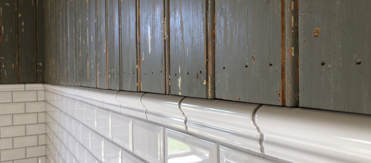 I vår intense jakt på historisk korrekte fliser til vårt bad endte vi opp med firmaet ITADesign og fliser fra engelske Fired Earth. Ikke de billigste eller de enkleste å fak i, det skal være sikkert! Men de var i riktig størrelse i tillegg til å være gjennomfarget noe som er avgjørende for det rette innrykket av et gammeldags bad. Nydelige hvite rektangulære fliser med tilhørende brystningslist på veggene og små sorte og hvite fliser (10×10 cm) i sjakkmønster på gulvet. Over brystningen satt vi tilbake det gamle perlestaffpanelet som så ble malt med linoljemaling i opprinnelig farge.