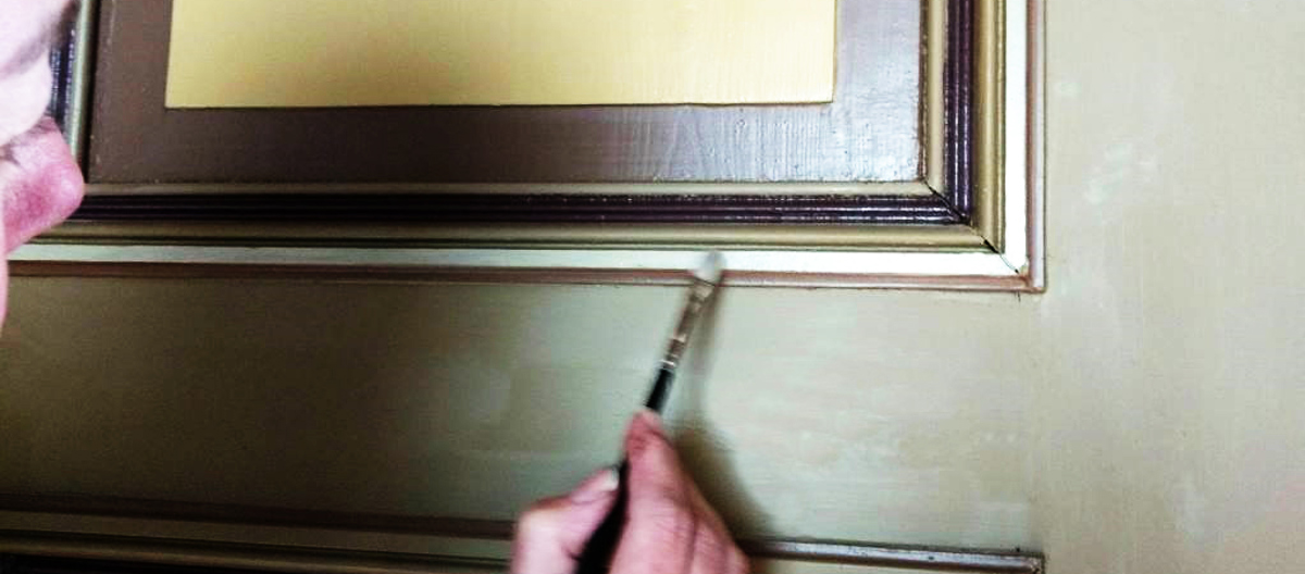 Vi er godt i gang med å linoljemale dører i bibliotekrommet. Etter forbilde fra dører i finstue og hall i Villa Bergfall er i alt 7 ulike farger brukt – en hovedfarge og seks kontrastfarger.