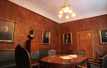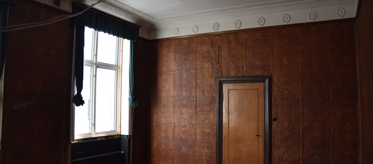 Egentlig var beslutningen at vi lar det være med fargetrappen. Undersøkelsene våre har vist at interiøret i direksjonsrommet kan deles inn i to hovedfaser. Første etappe var innredningen i 1916. Listverk og dører var lyst ådret og lasert. På 1930-tallet, kanskje det var ved 75-årsjubileet i 1931/1932 eller ved 80-årsjubileet i 1936, ble rommet gitt en oppgradering. Ikke noen totalrenovering, men en forsiktig modernisering i tråd med det konjunkturene tillot uten å vekke anstøt. Da kan også gardinbrettene ha fått seg et strøk maling.
