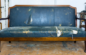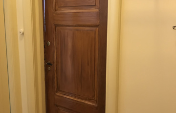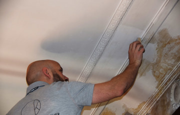I samråd med Byantikvarens Vidar Trædal bestemte vi oss derfor for å tilbakeføre gardinbrettene til 1916, slik at lampen og rammene fikk noen de kunne snakke med. Valget falt på malerikonservator Nadine Huth fra Treskjærerverkstedet a/s på Fornebu. Og de var slett ikke så fine, da vi fikk dem ned fra veggen. Store flak med maling hadde løsnet eller falt av. Og tidligere forsøk på å reparere dem med spiker var mildt sagt halvhjertet. Så hvordan gripe an dette?