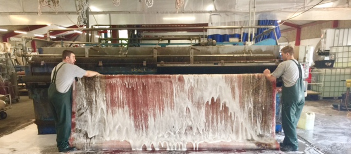 – Først ble teppet banket godt. Deretter la de det i bløteskum før det ble grundig vasket liggende flatt på gulvet. Spesialsåpen som benyttes til slik vask, smører fibrene for at de skal tåle behandlingen videre. Flekkene jeg pekte ut for deg, ble behandlet spesielt, men noen av dem lot seg dessverre ikke fjerne. Teppet er også, som del av behandlingen, satt inn med et middel for å beskytte det mot møllangrep. Etter vasken ble det heist opp, skylt grundig og sentrifugert, deretter festet til en bom og løftet opp til tørking i et eget luftetårn. Denne prosessen tar 12 timer. Når alt dette var gjort, ble det pakket og sendt tilbake til oss på Grini Mølle for videre reparasjon.
