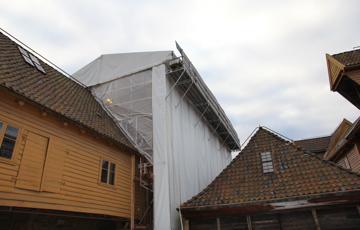 Lagerbygning på bryggen i Bergen Byggeår: ca 1769 Konstruksjon: Laft med sperretak Prosjekt: Skadeutbedring, etterisolering av yttervegger og tak