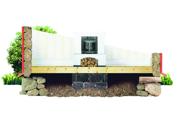 Etterisolering av etasjeskillet over kald kjeller med mineralull. Eksemplet viser hvordan det er isolert mellom gulvbjelkene.