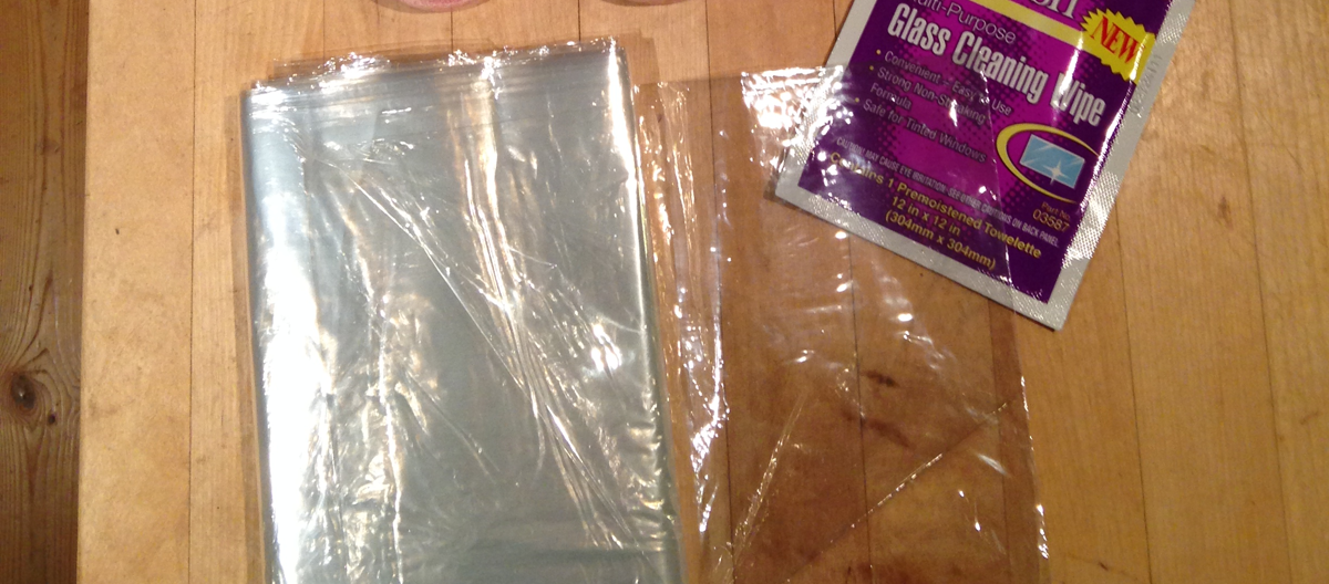 3 Ta ut folien og klipp den til passe størrelse. Den skal være litt større enn området du har teipet. Det kan være greit å få litt hjelp til så strekke ut folien. Fest den deretter til teipen. Prøv å stram den slik at det blir minst mulig ujevnheter i plasten.