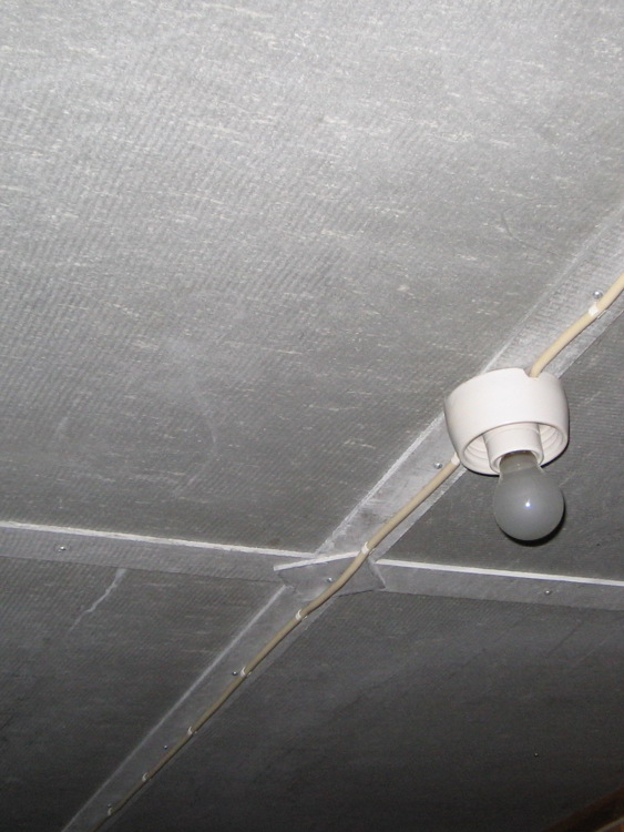 Eternitt (asbest) i himling i kjeller. I mange kjellere, og spesielt der det har stått en oljefyr, er det eternitt i taket. Disse platene er satt opp fordi de er gode brannskiller. De er ikke farlige å la stå - men hvis du maler dem så må fremtidige eiere informeres om at de finnes der! De er nemlig farlige når man begynner å rive dem ned. Eternitt (asbest) er et materiale som består av mange skarpe, tynne fibre. Disse er svært kreftfremkallende og farlig å håndtere og puste inn. Demontering av slike tak bør derfor utføres av bedrift med kurs og riktig sikkerhetsutstyr. Foto: Steinar Amlo, Norconsult AS