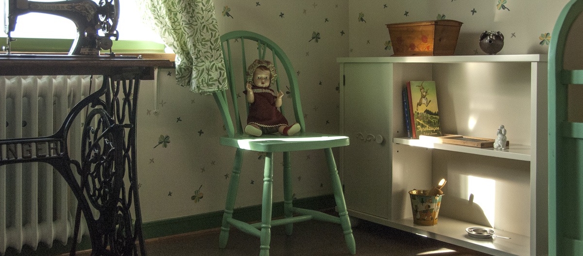 Jon Brænne har hatt jobben med å avdekker tapet- og fargelagene i dronningens barndomshjem. Her har han avdekket originaltapetet på Sonjas barneværelse fra den gang huset var nytt i 1935. Dette er et veldig typisk tapet fra samtiden der store deler av mønsteret peker tilbake på Art deco, mens det har fått funksjonalismens farger i sennepsgul, skarp grønn, sort og turkis.
