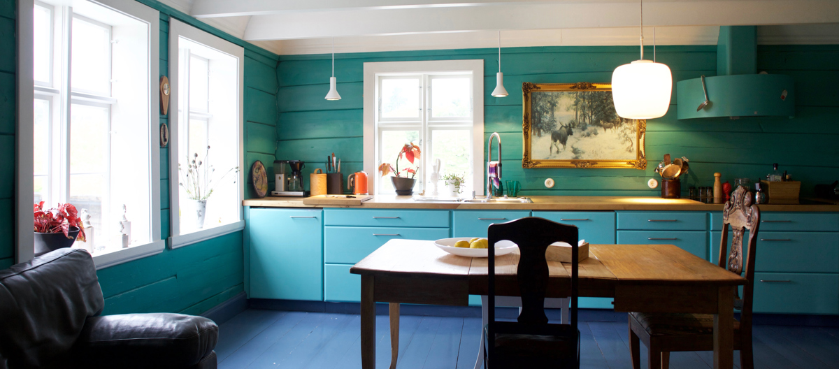 Tømmerveggene på kjøkkenet har en helt spesiell, skjør grønnfarge. – Fargen fant vi bak platene, og vi ville gjerne ha akkurat denne fargen på vegger og kjøkkenskap. Men å finne fram til den rette fargen viste seg ikke enkelt. I dag er resultatet helt nydelig. Ingvild forteller at det er brukt oljemaling og lasur for å få tilbake den fine glansen.
