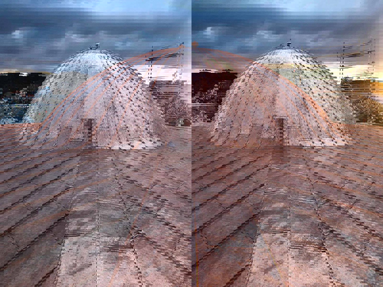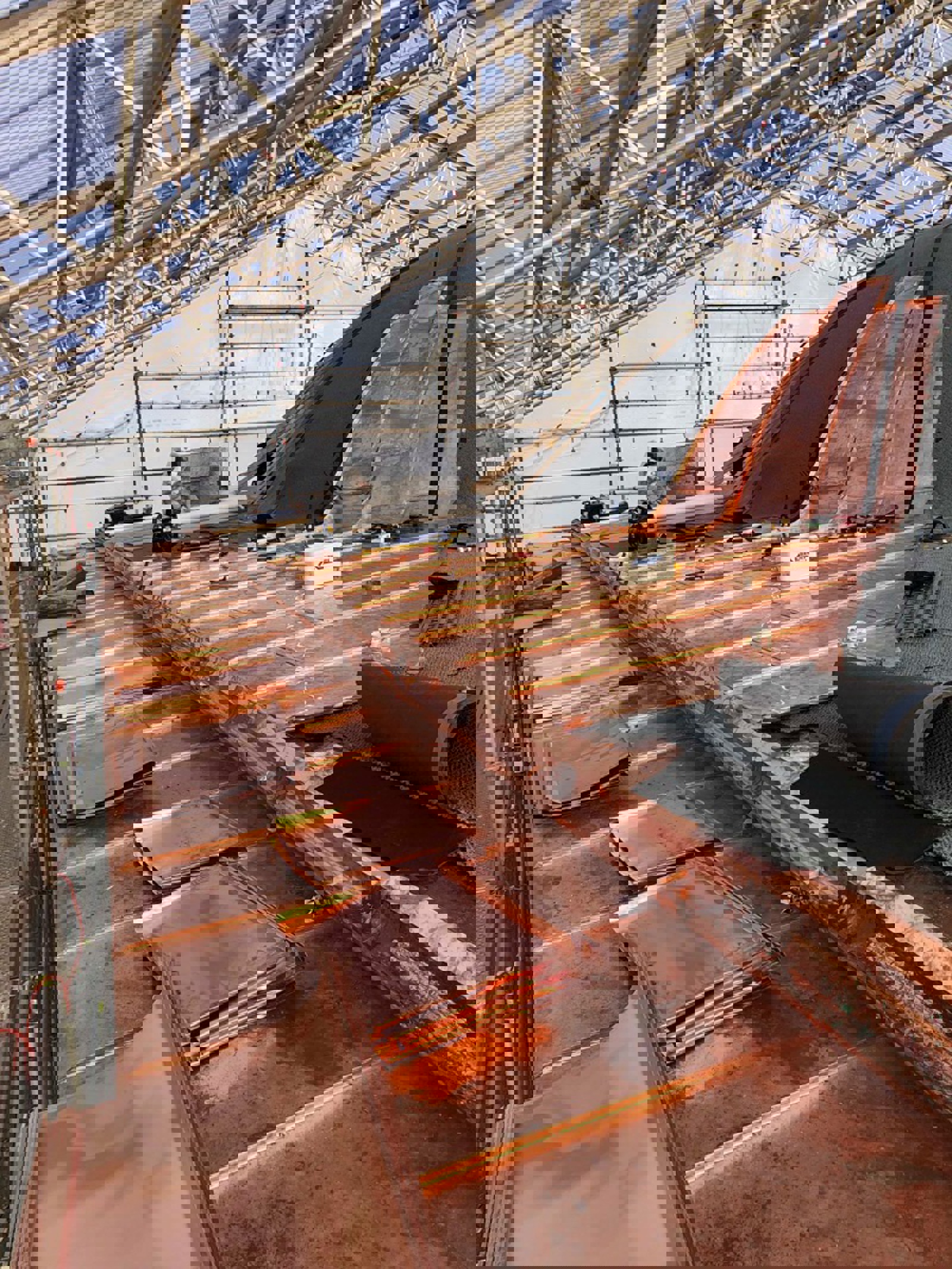 Trearbeidene på taket ble utført av Byggmesterkompaniet AS, ved tømrer Anders Steinnes, som gjorde en strålende jobb. ikke minst på kuppelen. Deretter begynte blikkenslagerne med kobbertekkingen. Underveis er det arbeidet med flotte false og tekkemetoder, samt strekking og krymping av kobberen!