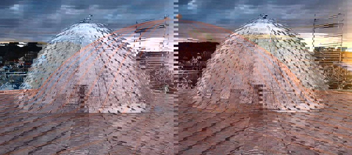 14.000 kg kobberplater og mange måneder senere ble prosjektet avsluttet i 2020 - i tide til å bli med i kampen om Bygg og Bevarprisen. Som vanlig var det i konkurranse med mange svært dyktige nominerte kandidater innenfor flere fagfelter. For Bygg og Bevarprisens jury ble kvaliteten på arbeidet, bruken av lærlinger sammen med et ønske om å løfte frem en viktig faggruppe for bygningsvernet avgjørende. - Aldri tidligere har en blikkenslagerbedrift vunnet prisen. Nå er vi glade for å hedre to faglig sterke og seriøse bedrifter prisen for 2020 uttaler juryformannen Sjur Mehlum. Juryens begrunnelse for tildelingen er klar: