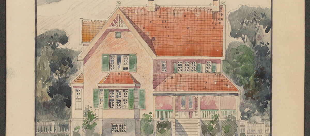Til mange av bygningne ble det også levert detaljerte tegninger som utforming av fasader, innramming av vinduer og dører. "Frøkenerne Jensen Bebyggelse ved Slemdal" tegnet av Olav Olson i 1901 - "Bagfasade" detaljer. Foto: Riksantikvaren