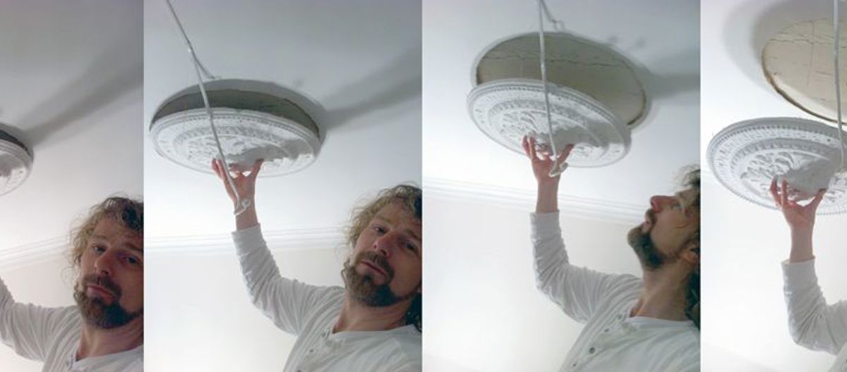 Forsiktiiiig!!! Rosetten tas ned. Så er det klart for å trekke strietak på nytt. Foto: Einar Nilsson