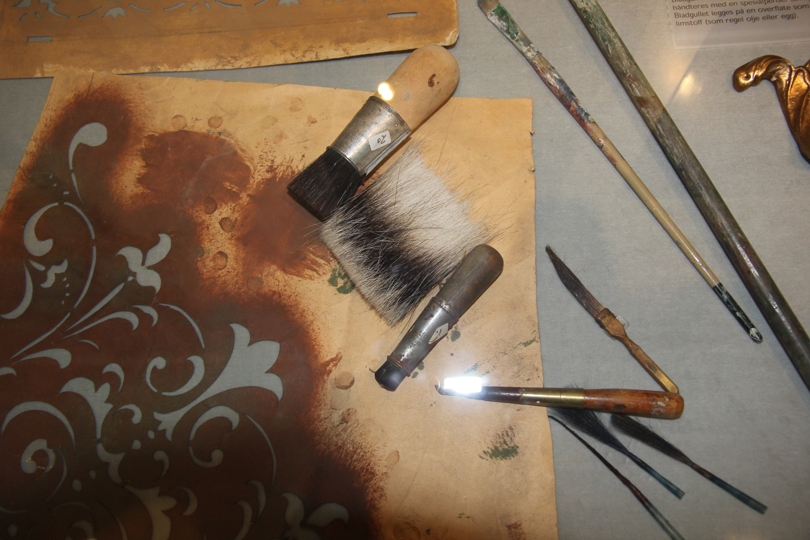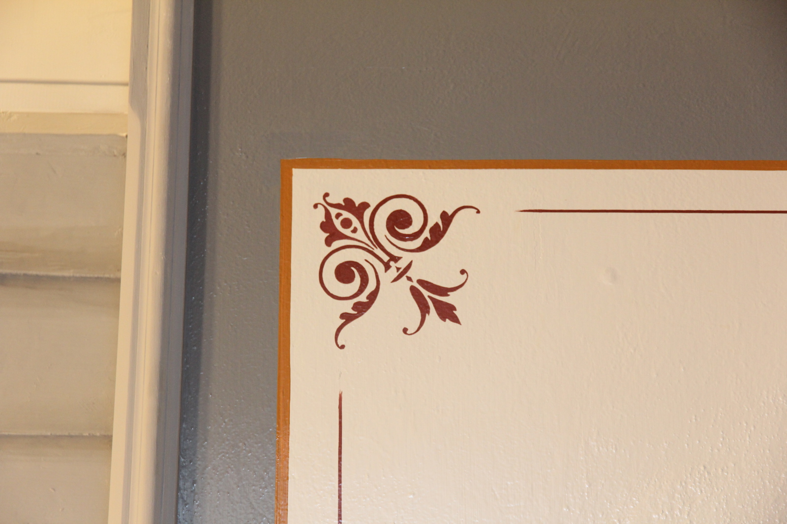 friluftsmuseet på Maihaugen, Lillehammer. Veggene er grønnmalte med en mørkere sjablongranke helt øverst på veggpanelet. Det finnes også en langsgående sjablongbord, over den malte brystningen. Sjablongranke og brystning er malt i samme dyprød farge. Dekoren er datert 1785 og regnes som det eldste eksemplet på sjablongdekorert interiør her i landet.