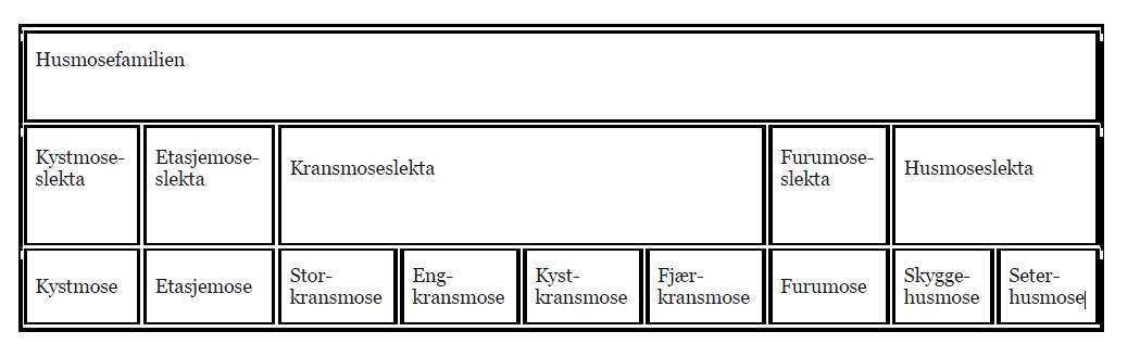 «Husmose m husmåsså; fleire slag mose for eksempel. Etasjemose Hylocomium splendens, furumose Plaurozium schreberi, og torvmosar Sphagnum sp. Bruka til tetting mellom tømmerstokkane i hus». (Seddelarkivet Ingeborg Donali, Oppdal)