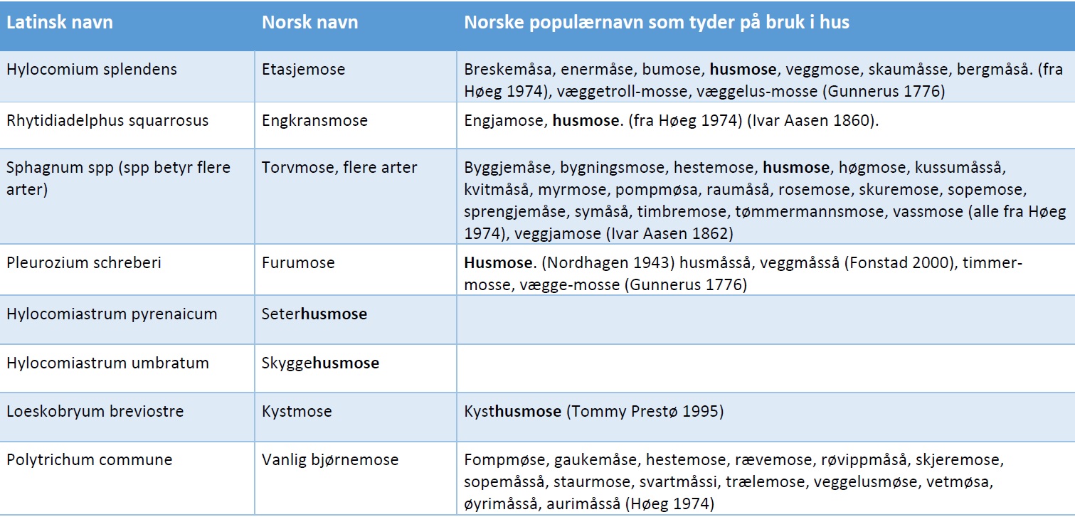 «Husmose vert bruka mellom stokkar i hus. Er ikkje kvitmose» (fra Ullensvang, Høeg 1974)